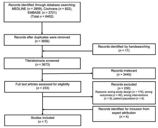 Through the literature search up to 2 April 2019, we identified 3656 records after removing duplicates. However, the screening of titles and abstracts lead to the exclusion of 3440 records. A total of 233 articles were eligible for the full-text assessment. The full-text evaluation led to the exclusion of 230 records (see Table S3 for a list of excluded articles and reasons for exclusion). After internal discussion in the author group (content experts), we identified an additional four studies for inclusion that met the review criteria but had not been identified in the primary literature search [24,25,26,27]. In total, we identified seven eligible prospective distinct cohort studies [24,25,26,27,28,29,30]. A PRISMA flow diagram presenting data on the study selection process is illustrated in Figure 1.