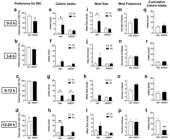 Cannabinoid CB1Rs control acute preferences for Western Diet. Veh = vehicle treatment; AM251 = 3mg per kg; SD = standard rodent chow; WD = western diet. Unpaired Student’s t-test, two-tailed (a–d,m–t); Two-way ANOVA with Holm-Sidak’s multiple comparison tests (e–l); * p < 0.05, ** p < 0.01. Results are expressed as means ± S.E.M; n = 7–8 per condition.