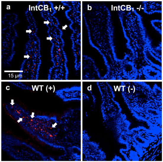 CB1R immunoreactivity is absent in the upper small-intestinal epithelium of conditional intestinal epithelium-specific CB1R-deficient mice. When compared to control mice (a, IntCB +/+), conditional intestinal epithelium-specific CB1R-null mice (b, IntCB1−/−) are deficient in immunoreactivity for CB1Rs in the upper small-intestinal epithelium. Wild-type C57BL/6Tac mice display immunoreactivity for CB1Rs in the upper small-intestinal epithelium (c, WT (+)), which is absent when the primary CB1R antibody is not included (d, WT(-)). White arrows point to representative red immunoreactivity for CB1Rs. Red = CB1R immunoreactivity; blue = DAPI. WT = wild-type mice. (+) = with CB1R primary antibody; (-) = without CB1R primary antibody.