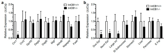 CB1R deficiency in the intestinal epithelium of IntCB1−/− mice was further confirmed by qRT-PCR (Figure 3a,b). IntCB1−/− mice, when compared to IntCB1+/+ controls, were deficient in expression of mRNA for CB1Rs (Cnr1) in the jejunum epithelium (Figure 3a, p = 0.031). Expression of mRNA for other components of the endocannabinoid system in the jejunum epithelium was unaffected, including cannabinoid CB2Rs (Cnr2; Figure 3a, p = 0.892), g-protein coupled receptor 55 (Gpr55; Figure 3a, p = 0.736), diacylglycerol lipase alpha (Dagla; Figure 3a, p = 0.825), diacylglycerol lipase beta (Daglb; Figure 3a, p = 0.798), monoacylglycerol lipase (Mgll; Figure 3a, p = 0.872), alpha beta hydrolase domain containing 6 (Abhd6; Figure 3a, p = 0.314), N-acyl-phosphatidylethanolamine-hydrolyzing phospholipase D (Napepld; Figure 3a, p = 0.217), and fatty acid amide hydrolase (Faah; Figure 3a, p = 0.986). In addition to the jejunum epithelium, IntCB1−/− mice were deficient in expression of mRNA for CB1Rs (Cnr1) in the duodenum epithelium (Figure 3b, p = 0.009), ileum epithelium (Figure 3b, p = 0.038), large intestine epithelium (Figure 3b, p = 0.039), but not in the small-intestinal submucosa/muscle/serosal layers (Figure 3b, p = 0.633), stomach (Figure 3b, p = 0.602), liver (Figure 3b, p = 0.593), pancreas (Figure 3b, p = 0.9), and epididymal fat (Figure 3b, p = 0.14).