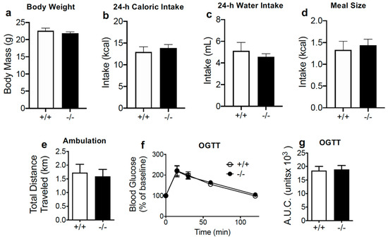 IntCB1−/− and IntCB1+/+ control mice displayed similar body weights (Figure 4a, p = 0.404), and baseline 24-h caloric intake (Figure 4b, p = 0.52), 24-h water intake (Figure 4c, p = 0.487), average meal size (Figure 4d, p = 0.653), ambulation (Figure 4e, p = 0.741), and glucose clearance during an oral glucose tolerance test (Figure 4f,g; 15, 30, 60, 120 min, ns; total area under curve, p = 0.847).