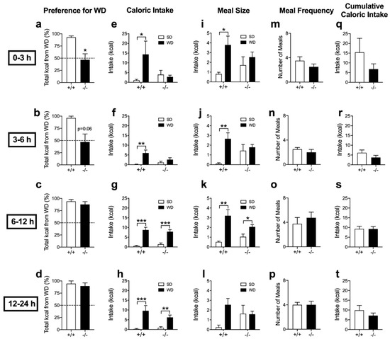 Congruent with these data, control IntCB1+/+ mice ate significantly more kcals from WD when compared to SD by 3 h (Figure 5e, p = 0.02), during the 3–6 h interval (Figure 5f, p = 0.004), the 6–12 h interval (Figure 5g, p < 0.001), and the 12–24 h interval (Figure 5h, p < 0.001) after initiation of the preference test. These effects were absent in IntCB1−/− mice by 3 h (Figure 5e, p = 0.732), and during the 3–6 h interval (Figure 5f, p = 0.205); however, intakes for WD rebounded in IntCB1−/− mice by the 6–12 h interval (Figure 5g, p <0.001) and during the 12–24 h interval (Figure 5h, p = 0.002). Moreover, IntCB1+/+ mice displayed larger meal sizes of WD versus SD by 3 h (Figure 5i, p = 0.031), during the 3–6 h interval (Figure 5j, p = 0.005), and the 6–12 h interval (Figure 5k, p = 0.002), but not during the 12–24 h interval (Figure 5l, p = 0.072) after initiation of the preference test. These effects were absent in IntCB1−/− mice by 3 h (Figure 5i, p = 0.404), during the 3–6 h interval (Figure 5j, p = 0.589), and the 12–24 h interval (Figure 5l, p = 0.958); however, meal size of WD versus SD was increased in InCB1−/− mice during the 6–12 h interval (Figure 5k, p = 0.044). No significant changes were found in meal frequency for IntCB1−/− mice when compared to IntCB1+/+ controls by 3 h (Figure 5m, p = 0.239), during the 3–6 h interval (Figure 5n, p = 0.49), the 6–12 h interval (Figure 5o, p = 0.521), and the 12–24 h interval (Figure 5p, p = 0.99) after initiation of the preference test. In addition, no significant changes were found in total cumulative caloric intake (i.e., total kcals from WD + SD) for IntCB1−/− mice when compared to IntCB1+/+ controls by 3 h (Figure 5q, p = 0.196), during the 3–6 h interval (Figure 5r, p = 0.233), the 6–12 h interval (Figure 5s, p = 0.974), and the 12–24 h interval (Figure 5t, p = 0.305) after initiation of the preference test.