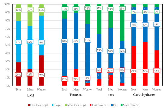The three major nutrients (proteins, fats, and carbohydrates) of DG are set as energy balance by the ratio of energy intake. For proteins, 75% of subjects were in the DG range (13–20%); 36.6% of subjects exceeded the DG range (20–30%) of fats; and 48.6% were less than the DG range (50–65%) for carbohydrates. The proportion of woman with less than target value of BMI was higher than men. Proportion of men with more than target value of BMI was higher than women. The proportion of men whose intakes of macronutrients were less than TG was higher than women. The proportion of women whose intakes of proteins and fats were more than TG was higher than women.