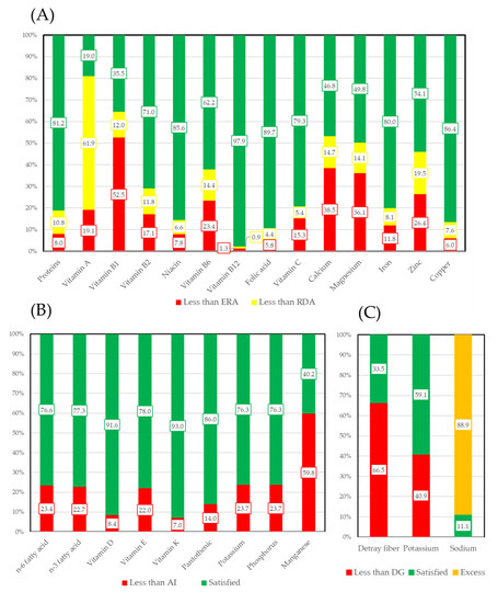 Meeting of vitamins, macro minerals, and micro minerals. Levels were determined by Dietary Reference Intakes for Japanese. Figure 2 shows the proportion of subjects whose intake of each nutrient was sufficient based (A) EAR and RDA. (B) AI. (C) DG. EAR: Estimated Average Requiremen. RDA: Recommended Dietary Allowance. AI: Adequate Intake. DG: Tentative Dietary Goal for preventing LRDs.