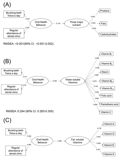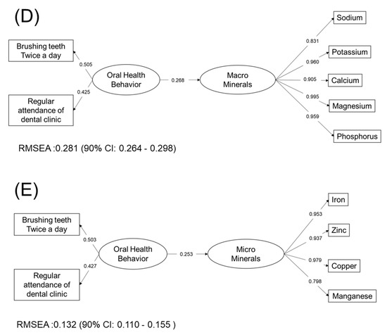 Structural equation modeling of oral health behavior and nutrition intakes: (A) three macronutrients; (B) water-soluble Vitamins; (C) fat-soluble vitamins; (D) macro minerals; and (E) micro minerals.