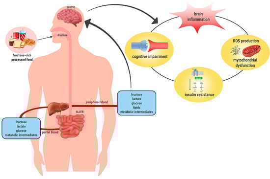 The systemic inflammation triggered by fructose can, in principle, induce neuroinflammation, brain oxidative stress and other metabolic perturbations through the import of inflammatory cytokines and/or other plasma metabolites into the CNS. An alternative hypothesis could consider the entry of fructose into the brain and its direct effect on the functional activities of neuronal and glial cells.