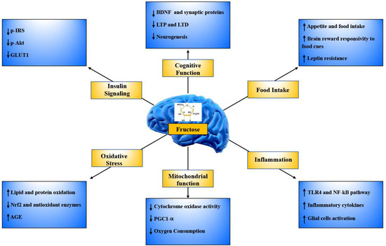 Major brain changes following fructose dietary introduction. The boxes indicate proteins and mechanisms modulated by fructose treatment in the brain in the context of the regulation of food intake, neuroinflammation, mitochondrial function, oxidative stress, insulin signaling and cognitive function. Up arrows indicate parameters stimulated and down arrows indicate parameters reduced by fructose intake. p-IRS = phosphorylated insulin receptor and insulin receptor substrate 1; p-Akt = serine/threonine protein kinase B; GLUT1 = glucose transporter 1; NRF2 = nuclear factor 2; AGE = advanced glycation end products; BDNF = brain derived neurotrophic factor; LTP = long-term potentiation; LTD = long-term depression; PGC1-α = peroxisome proliferator-activated receptor gamma coactivator-1 alpha; TLR4 = toll-like receptor 4; NF-kB = nuclear factor kappa-light-chain-enhancer of activated B cells.