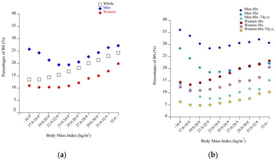 In our previous study of 60,000 people living in a different region from that currently investigated [], the results showed a J-shaped relationship between the prevalence of BS and BMI in a population-based study enrolling men and women. In that study, the proportion of men was higher (62.7%) than in the current study (53.7%), which might strengthen the effect of the specific characteristic among low-body-weight men, thereby showing a mild or moderate J-shaped relationship of BS against BMI, even when the analysis was conducted for the entire cohort. Unfortunately, due to its relatively small sample size compared with the current study, that study did not analyze the sex-related difference in the results.