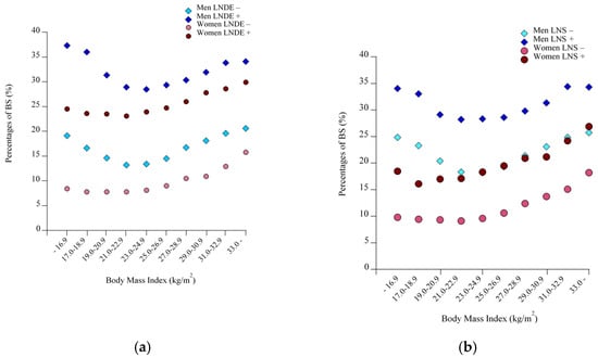 In the cohort as a whole (both men and women), the prevalence of BS increased linearly across the increasing BMI strata (Figure 1a, p < 0.0001, Cochran-Armitage test). However, when subjects were divided into men and women, the prevalence of BS showed a U-shaped relationship against BMI in men. The prevalence of BS in the lowest BMI category, ≤ 16.9 kg/m2, (25.8%) was significantly higher than that in the reference BMI group of 21.0–22.9 kg/m2 (19.4%, p < 0.0001), whereas no difference was observed between the lowest and highest BMI groups: ≤16.9 kg/m2 and ≥33.0 kg/m2 (27.2%) (p = 0.15). In contrast, in women the prevalence of BS showed a slight J-shaped relationship with increasing BMI, where no significant difference was observed between the lowest BMI group (11.0%) and the reference BMI group (10.3%, p = 0.21). When male subjects were restricted to those in their 40s or those with LND or LNS (Figure 1b and Figure 2a,b), the prevalence of BS increased, maintaining the U-shaped relationship. By contrast, as shown in Figure 3, the prevalence of LND and LNS each increased linearly with increasing BMI, regardless of men and women, indicating that LND and LNS were less prevalent in men with low BMI.
