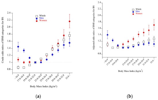 A logistic regression analysis showed a linear relationship between crude ORs of BMI categories for BS in the set of all subjects (Figure 4a). However, when subjects were divided into men and women, the relationship was transformed into U-shaped relationships in men, which was further transformed into a blunt left-right inverted J-shaped relationship after adjustment for confounding factors (Figure 4b). In women, a slight J-shaped relationship was observed between crude ORs and BMI categories (Figure 4a), which was largely unchanged even after adjustment for confounding factors (Figure 4b). When men and women were combined and adjusted ORs were calculated, a slight J-shaped relationship was observed, similar to that in women alone (Figure 4b). Supplementary Table S1 shows concrete values of odds ratios and 95% confidence intervals.