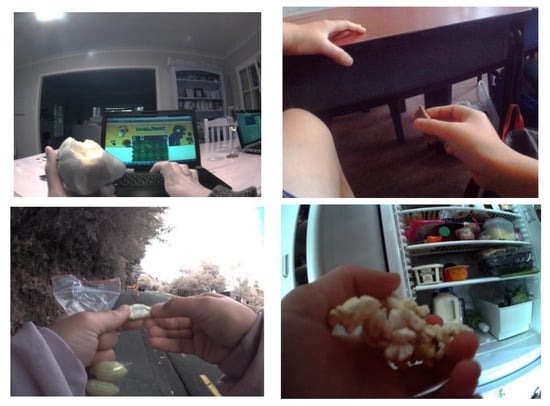 The coding process involved viewing each sequential image, with frequency and context codes entered in a pre-formatted Excel spreadsheet. Coding was completed by two researchers in 2019/20. Snacking episodes were coded when one of two conditions were met: (1) The image sequence showed participants lifting a snack food or beverage towards their face; or (2) The image sequence showed participants handling a snack food or beverage, accompanied by evidence that the product was decreasing in quantity. Figure 1 shows several examples of snacking episodes. Like previous wearable camera studies [,], we considered snacking episodes as ‘complete’ when five minutes (approximately 43) images passed without further consumption evidence. After this time, evidence of further snacking was considered to be new snacking episodes.