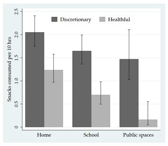 Children’s consumption of discretionary and healthful snacks per 10 h by eating location.