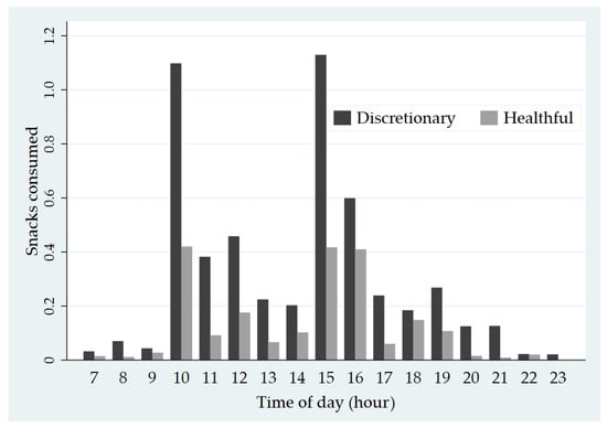 Most snacks (55.9%; 4.6 per 10 h) were consumed in the afternoon period between 12:00 and 17:59 h. Proportionately fewer snacks were consumed in the morning between 06:00 and 11:59 h (29.7%; 2.4 per 10 h) and evening between 18:00 and 23:59 h (14.0%; 1.2 per 10 h). Figure 3 summarizes rates of discretionary and healthful snack consumption by hour. Children ate more discretionary snacks than healthful snacks across all hours. The highest rates of snacking were observed in the hours of 10am, 3pm and 4pm.