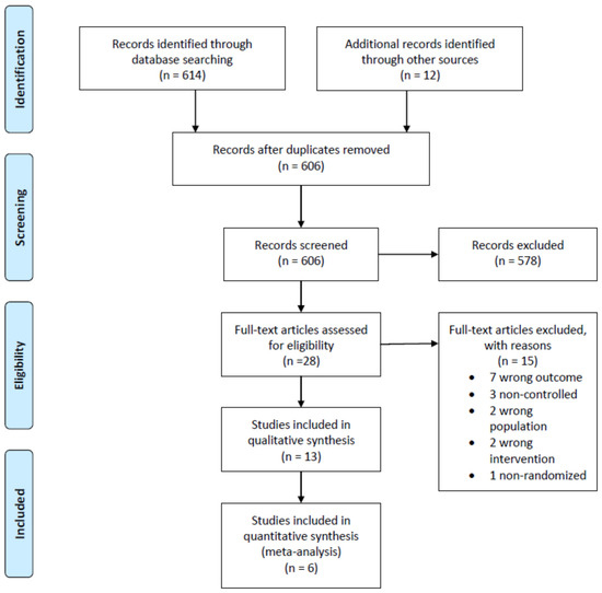 The search process yielded 606 records (Figure 1). Of these, 28 were selected after review and assessed for eligibility. Of those, 13 studies were included in the qualitative synthesis. Among them, six studies (two on vitamin E and four on vitamin D) had sufficient data and were included in the meta-analysis. No unpublished relevant studies were obtained.