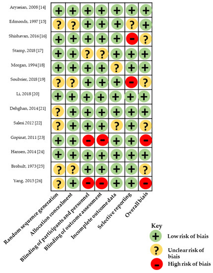 Risk of bias in all 13 studies based on Jadad score of randomized controlled trials is reported in Table A1. All selected studies were randomized controlled trials, and only two of them were not double-blind and thus had a Jadad score of 3. Nine of the 13 studies had a Jadad score of 4 or more. Six studies did not report the used randomization sequence. Risk of bias was also assessed using Cochrane Collaboration’s tool (Figure 2 and Figure 3).