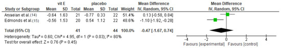 We performed a meta-analysis of both studies regarding the efficacy of vitamin E supplementation in VAS pain (Figure 4). On 85 patients in two groups, the mean difference [95% CI] in VAS pain was −0.47 [−1.67; 0.74] cm (p = 0.45), thus not statistically significant. There was a high heterogeneity in the studies (I² = 80%).