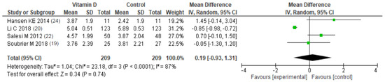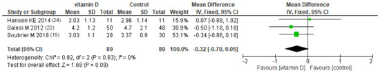 The other six studies assessed the efficacy of vitamin D supplementation on active RA patients, with or without vitamin D deficiency. Evolution of DAS-28 under vitamin D supplementation was assessed in three studies (Soubrier, Salesi and Hansen) [19,22,24]; none of them found a statistically significant change compared with placebo. We meta-analysed DAS-28 after the end of follow-up in intervention and control groups (Figure 5). Among 178 patients, the mean difference [95% CI] in DAS-28 was −0.32 [−0.70; 0.05] (p = 0.09), thus not statistically significant. There was no heterogeneity in the studies (I² = 0%).