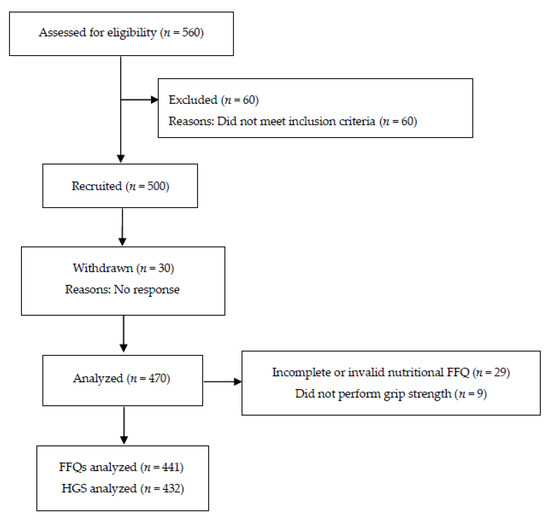 Of the 500 participants enrolled in the study, 30 participants withdrew (no longer interested in study participation), 470 participants completed the study, 29 participants were excluded due to incomplete or invalid nutritional data (FFQ), and 441 participants were included in the final analysis. Participants who were missing values for HGS were excluded only from the HGS comparisons (Figure 1). General characteristics and nutrient intake of the study participants are summarized in Table 1.