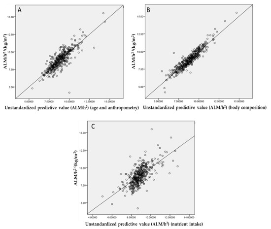 Multiple regression analyses between ALM/h2 and age and anthropometry ((A) R2 = 0.869), body composition ((B) R2 = 0.713), and nutrient intake ((C) R2 = 0.450). (n = 441). Abbreviations: ALM, appendicular lean mass.