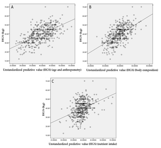 Multiple regression analyses between HGS and age and anthropometry ((A) R2 = 0.360), body composition ((B) R2 = 0.347), and nutrient intake ((C) R2 = 0.146). (n= 432). Abbreviations: HGS, handgrip strength.