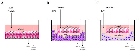Figure 1. The scheme of experiments performed on Caco-2 cells (A) and Caco-2/THP-1 or Caco-2 macrophages co-culture models (B,C).