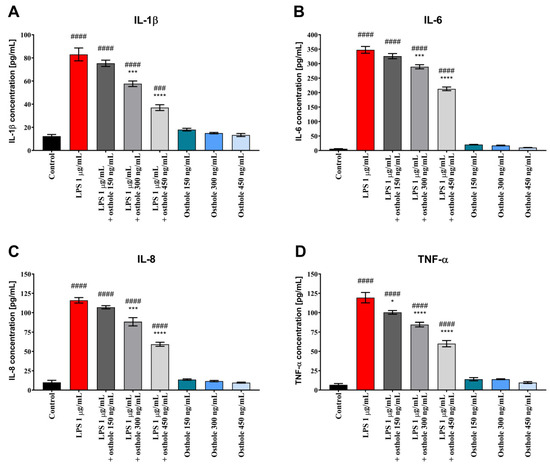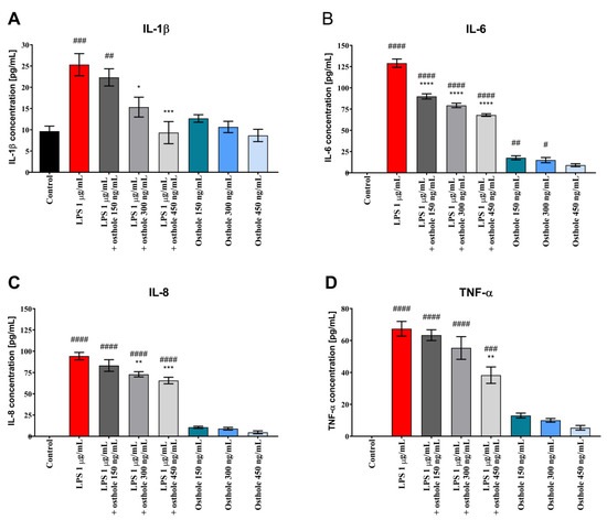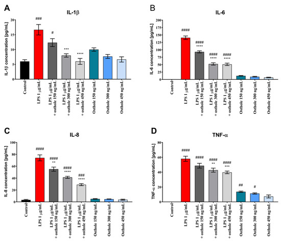 Figure 4. The level of IL-1β (A), IL-6 (B), IL-8 (C) and TNF-α (D) in Caco-2/macrophages co-culture after incubation with LPS (1 µg/mL), osthole (150–450 ng/mL) and its mixtures. Horizontal line shows mean and bars depict standard error of mean. Statistically significant differences in comparison to control (#—p < 0.05, ##—p < 0.01, ###—p < 0.001, ####—p < 0.0001) and to cells treated with LPS (*—p < 0.05, **—p < 0.01, ***—p < 0.001, ****—p < 0.0001) are marked.