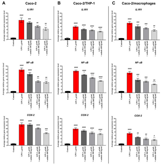 Figure 5. Gene expression level after Caco-2 monoculture (A), Caco-2/THP-1 (B) and Caco-2/macrohpages (C) co-cultures incubation with LPS (1 µg/mL) and with LPS and different concentrations of osthole (150–450 ng/mL). Horizontal line shows mean and bars depict standard error of mean. Gene expression levels were scaled to the control sample (expression level = 1). Statistically significant differences in comparison to control (#—p < 0.05, ##—p < 0.01, ###—p < 0.001, ####—p < 0.0001) and to cells treated with LPS (*—p < 0.05, **—p < 0.01, ***—p < 0.001, ****—p < 0.0001) are marked.