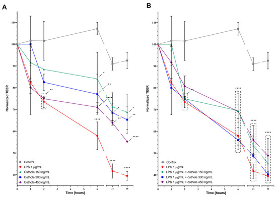 Figure 6. Effects of LPS, osthole (A) and its mixtures (B) on transepithelial electrical resistance in Caco-2 monolayer). Horizontal line shows mean and bars depict standard error of mean. Statistically significant differences in comparison to control are marked (*—p < 0.05, **—p < 0.01, ****—p < 0.0001).