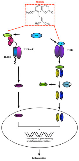 Pattern recognition and transmembrane receptors play a pivotal role in the initiation of the immune response caused by inflammation inducers (e.g., LPS). One among these, toll-like receptor 4 (TLR4), senses the harmful stimuli and recruits the coordinate activation of transcription factors, including NF-кB [71,72]. NF-кB, as well as IL1R1-activated COX-2, translocates to the nucleus and facilitates transcription of genes encoding pro-inflammatory CKs (Figure 7). We suspect that osthole may act as a regulator in these pathways, and extended studies are needed to uncover the molecular basis of its anti-inflammatory activity.