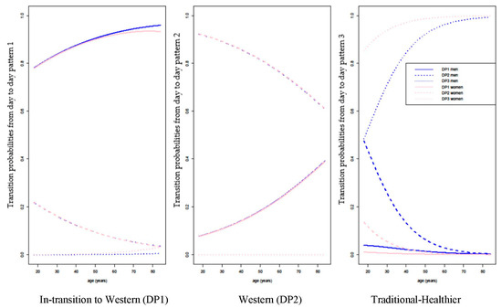 Figure 2 shows the transitional probabilities by age and sex based on the estimated latent transition model for each DP. It shows that there is an increasing transition with age from “In-transition to Western” to the others (mainly “Western”). Transition from “Western” to “In-transition to Western” decreases with age and is very similar by sex. There is an increasing transition from the “Traditional-Healthier” DP to the others (mainly “Western”) with increasing age, and a clear sex effect (transition is faster in women).