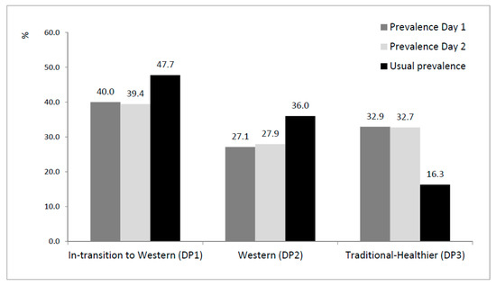 The classification of each dietary pattern is estimated based on the mean of food weigh intake in the two days which is likely insufficient to remove the within-person variability of dietary intake. Therefore, the prevalence of dietary patterns is influenced by the within-person variability (which is not removed by averaging the food weight intake).