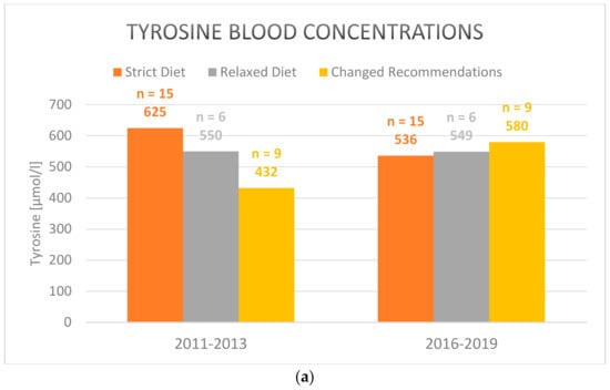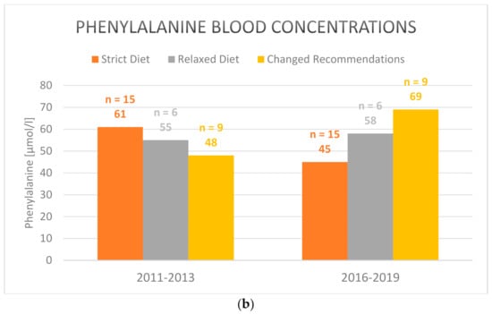 Phenylalanine levels in the 2016–2019 period were higher under a simplified diet, showing again non-inferiority of a relaxed diet. Increased phenylalanine levels are thought to be protective in terms of neurocognitive function []. After the change of diet, phenylalanine blood concentrations were predominantly within the normal range.