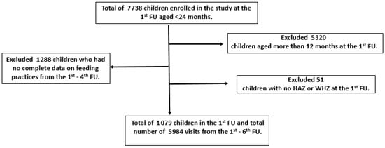 For our study, only children aged 0–12 months at the 1st FU were selected to investigate their feeding practices for the first year of life. Out of these 2418 children, only those with complete data on feeding practices and anthropometric measurements were included for analysis. Hence, the sample size for the current data analysis was 1079 children in the 1st FU, with a total number of 5984 follow up visits (Figure 1).