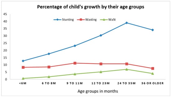 The percent of stunting almost doubled from 0–5 months of age to 9–11 months of age (12.8%–23.2%), and it kept increasing with a peak of 38.9% among children aged 24–35 months (Figure 2). The percent of wasting was consistent (~10%) across all age groups. The percentage of WaSt increased from 0.7% among children aged less than 6 months to 7.0% among children aged 24–35 months.