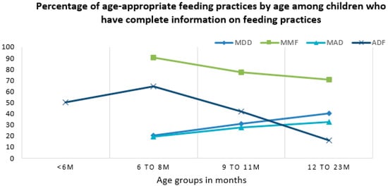 Interestingly, there were differences in the reasons for inadequate age-appropriate feeding practices across the age groups. Infants received diets that lacked quality and frequency (MDD and MAD), while older children (12–23 months of age) had diets that lacked in quantity and frequency (ADF and MMF). Similar to our findings, a study on the relationship of child feeding and growth in 14 countries found that food quality and frequency (MDD and MAD) were often better among older children [].