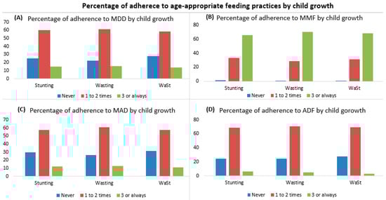 Percentage of adherence to age-appropriate feeding practices among children aged 0–23 months by their growth from the 1st to 6th follow-up. Stunting = height-for-age Z score <−2 standard deviation; Wasting = weight-for-height Z score <−2 standard deviation; and WaSt = concurrence wasting and stunting. MDD = minimum dietary diversity; MMF = minimum meal frequency; MAD = minimum acceptable diet; and ADF = age-appropriate daily feeding. (A) Percentage of total number of adherence to MDD by child growth; (B) Percentage of total number of adherence to MMF by child growth; (C) Percentage of total number of adherence to MAD by child growth; and (D) Percentage of total number of adherence to ADF by child growth.