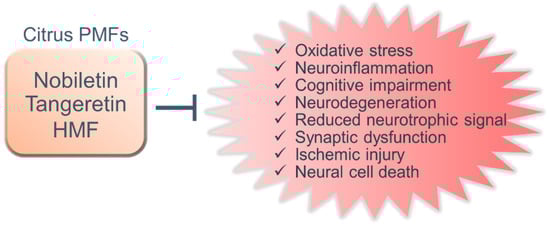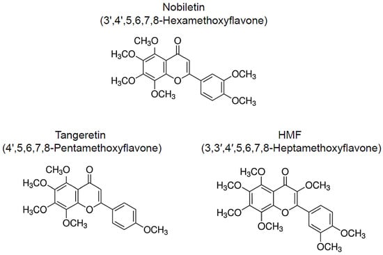 Numerous natural resources contain bioactive substances, which allows them to function as treatments and means of preventing geriatric and neurodegenerative diseases [,,,,,]. Citrus peels are a rich source of polymethoxylated flavones (PMFs) and have been widely used as a crude drug in traditional herbal medicines. The following compounds are major PMFs in citrus fruits (Figure 1): nobiletin (3′,4′,5,6,7,8-hexamethoxyflavone, C21H22O8), tangeretin (4′,5,6,7,8-pentamethoxyflavone, C20H20O7), and 3,3′,4′,5,6,7,8-heptamethoxyflavone (C22H24O9, HMF) []. Because of their anti-inflammatory and antioxidant effects, these citrus-derived PMFs have the potential to prevent neurodegenerative and neurological disorders [,,,,,]. In addition, these PMFs have shown beneficial effects against hyperlipidemia [,], obesity [,], diabetes [,], cardiovascular dysfunction [,], and cancer [,,]. In this study, we focus on the neuroprotective and ameliorative effects of citrus-derived PMFs, nobiletin, tangeretin, and HMF, against central nervous system dysfunction in several rat and murine models of central nervous system disorders and related diseases as well as their mechanisms of action.