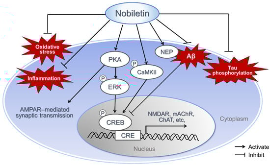 Thus, nobiletin might be a potential candidate for amelioration of neurological diseases, such as AD, via antioxidative, anti-inflammatory, anti-Aβ pathology and regulation of signal cascades related to neurotransmission and CRE-mediated transcription (Figure 2).