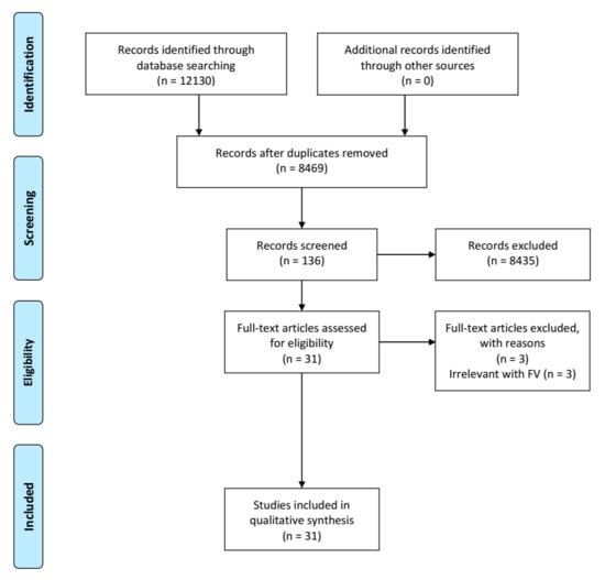 The search yielded 8469 articles after the removal of duplicates. By screening abstracts and titles, we excluded 8435 studies that did not meet the eligibility criteria and after screening of the full texts, we excluded three additional studies irrelevant to FV consumption. Thus, 31 studies, all of which passed the quality evaluation, remained for inclusion in this review.