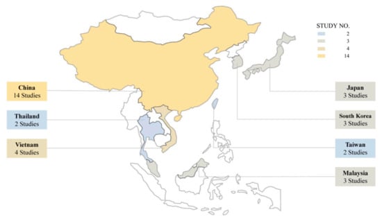 Using the Free and Open Source, QGIS (version 3.10.4) (QGIS.org), we plotted the number of eligible studies from each territory on a map of East and Southeast Asia (Figure 2). China had the highest number of eligible studies (14), followed by Vietnam (4), Japan (3), Malaysia (3), South Korea (3), Taiwan (2), and Thailand (2). The number of studies in each territory suggests two main implications. One is that a predominantly high number of studies examined the impacts of food environments on FV consumption in China, possibly attributable to the increasing prevalence of dietary health issues associated with its unprecedented economic progress and rapid nutrition transition stemming from the rise in the standard of living over the last decade []. In addition, as few studies took place in East and Southeast Asian countries other than China, the other implication is that these countries have a large research blind spot and possible lack of resources available for investigating how food environments affect FV consumption.