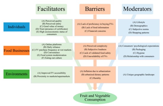 Therefore, this article aims to be the first systematic review studying the determinants associated with FV consumption in East and Southeast Asia. This effort adds value to the initiative addressing the importance of regional collaboration on promoting wellness in the population. The primary outcomes of this review are as follows: (i) a presentation of the results and implications of the included studies conducted in East and Southeast Asia, (ii) the identification of the facilitators, barriers, and moderators of FV consumption in food environments, and (iii) recommendations for policymakers and stakeholders on how to promote FV consumption.