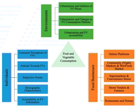 One study found a change in the pattern of FV consumption: Urban dwellers consumed more fruit and less grain-based food, possibly the result of the higher standard of living that followed urbanization []. The study also reported that the increase in FV consumption was faster in urban areas, with the urban population preferring FVs instead of rice, regardless of their urban status and income []. The demand for high-value food such as FVs increased significantly, as urban consumers consumed 114% more fruit than their rural counterparts []. Another study, however, identified a discrepancy between fruit and vegetable consumption by suggesting that urbanization reduced the demand for vegetables while increasing the demand for fruit []. This interesting finding invites additional research on the soundness of the negative effect of urbanization on vegetable demand.