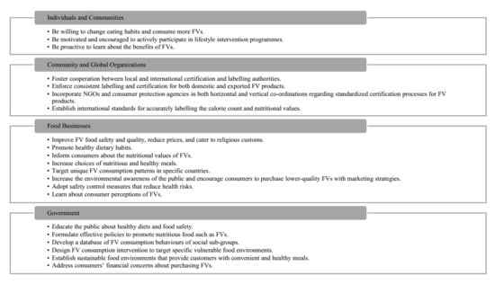 While studies commonly reported findings on the associations between a number of variables and FV consumption, scholars should attempt to find ways to increase the consumption of FVs. As Asian countries arguably share similar food cultures, they should foster knowledge exchange and promulgate realistic policies that target the interactions between FV consumption and food environments. Upon reviewing the papers included in this paper, we propose the following recommendations that stakeholders and policymakers (i.e., individuals, communities, food businesses, governments, and local and global organizations) should consider to improve FV consumption. The overall recommendations are outlined in Figure 5.