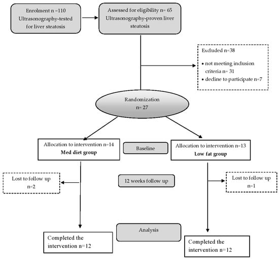Twenty-seven overweight or moderately obese men with a body mass index (BMI) of 25 to 35 kg/m2, 27–42 years of age, with ultrasonography-diagnosed NAFLD, were enrolled in this study (Figure 1). All participants received a full medical examination and performed standard blood tests before enrolment. Participants were recruited at the Centre of Research Excellence in Nutrition and Metabolism, Institute for Medical Research, from February 2013 to March 2015. Randomization was performed using block-balanced randomization in a 1:1 ratio into the Med diet and low-fat diet groups using a computer-generated sequence. The inclusion criteria were adult male patients, overweight or moderately obese, with ultrasonography-confirmed NAFLD. Subjects who had evidence of any liver disease other than NAFLD, diabetes mellitus, thyroid disease, serious gastrointestinal disease, cardiac, renal, or active autoimmune disease were excluded from the study. The exclusion criteria also involved alcohol consumption (>20 g/day), smoking habits, and using hepatotoxic drugs. Weight loss of 3 kg or more in the last 3 months, taking antioxidant supplements or fish oil/omega (3 supplements), or high intakes of fish, flaxseed, or walnuts (more than 2 servings per week) were also exclusion criteria. The study was approved by the Ethics Committee of the University of Belgrade (Ethics number 36/18/2011), in accordance with the principles of the Declaration of Helsinki, as part of a research project of the Ministry of Science of the Republic of Serbia (III41030).