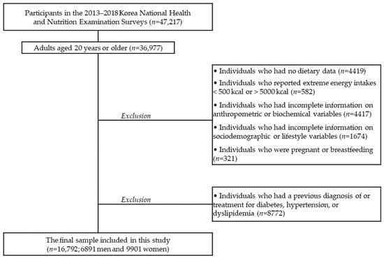 A total of 36,977 adults aged ≥20 years from the 2013–2018 KNHANES were eligible for this study. Among the 36,977 adults, individuals who had no dietary data (n = 4419), reported extreme energy intakes (<500 kcal or >5000 kcal; n = 582), had incomplete information on anthropometric or biochemical measures (n = 4417), had incomplete information on sociodemographic or lifestyle variables (n = 1674), and/or were pregnant or breastfeeding (n = 321) were excluded from the analyses. In addition, individuals who had been diagnosed or treated for dyslipidemia, diabetes, or hypertension were excluded (n = 8772) because the diseases can alter individuals’ diet. The final sample included 16792 Korean adults (6891 men and 9901 women). Figure 1 shows the flow of the study population selection. The study was conducted in accordance with the Declaration of Helsinki and was approved by the Institutional Review Board of the Korea Centers for Disease Control and Prevention (IRB No. 2013-07CON-03-4C, 2013-12EXP-03-5C, 2018-01-03-P-A). Written informed consent was obtained from each subject.
