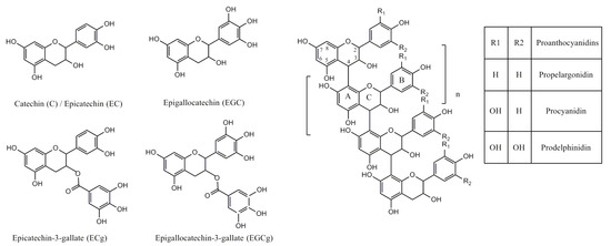The high antimicrobial and immunomodulatory activities of proanthocyanidins make them an interesting class of phytonutrients for the prevention and treatment of periodontal diseases [7,8]. An additional benefit is their natural dentin cross-linker activity and inhibition of MMPs, which may be helpful in adhesive dentistry [9]. The bioactivity of proanthocyanidins arises from their unique chemical structure [10]. Proanthocyanidins are highly hydroxylated structures built from flavan-3-ol blocks, forming oligomeric structures of various numbers of units (from two to many). Mostly, the flavan-3-ol units are catechin (C), epicatechin (EC), or their substituted derivatives connected through the C4–C8 or C6 bonds (B-type). The term condensed tannins refers to their ability to form insoluble complexes with carbohydrates and proteins [9]. According to the number of hydroxyl substitutions in the B ring, proanthocyanidins can be categorized as propelargonidin (one hydroxyl substitution), procyanidin (two hydroxyl substitutions), and prodelphinidin (three hydroxyl substitutions) (Figure 1).