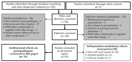 Finally, sixty-five studies met the inclusion criteria: 31 of these in vitro studies reported the influence of proanthocyanidins or flavan-3-ols on the growth, colony formation, and metabolic activity of potential periopathogens and the inhibition of periopathogens adhesion to oral mucosa cells; 36 in vitro studies reported the action of proanthocyanidins or flavan-3-ols in the immunological response of the periodontal tissues; 11 in vivo studies reported the influence proanthocyanidins or flavan-3-ols on periodontitis in animal models; and three controlled clinical trials reported the application of proanthocyanidins or flavan-3-ols in periodontitis. In some references (n = 16), the in vitro antibacterial tests were performed concurrently with investigations into the immunomodulatory effects in host cells or in animal models. The results of these studies pertaining to the inflammatory processes are reviewed in our other paper, separately [18].