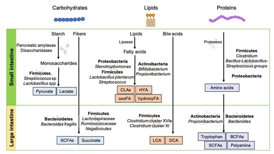 Dietary metabolism in the gastrointestinal tract. Dietary components—carbohydrates, lipids, and proteins—are digested into diverse metabolites via complex reactions of enzymes released from host tissues and microbial fermentation in the gut. BCFAs, branched chain fatty acids; CLAs, conjugated linoleic acids; DCA, deoxycholic acid; HYA, 10-hydroxy-cis-12-octadeccenoid acid; hydroxy FA, hydroxy fatty acid; LCA, lithocholic acid; oxoFA, oxo fatty acid; SCFAs, short chain fatty acids.