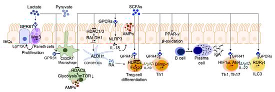 - GPCR activation. SCFAs can activate many cell types via GPCRs expressed on diverse cells including IECs, neutrophils, macrophages, DCs, B and T cells, and ILCs. Acetate is known to be a ligand of GPR43, and propionate is a ligand of GPR43 and GPR41. Butyrate induces activation through GPR41 and GPR109A []. SCFAs facilitate the production of inflammatory effector molecules by IECs in response to immune challenges including ethanol-induced breach, TNBS, and Citrobacter rodentium infection []. GPR41- and GPR43-deficient animals display abnormally low inflammatory responses in the gut []. SCFAs recognized by GPR43 and GRP109A on IECs activate the NLRP3 inflammasome, leading to IL-18 secretion for maintenance of the gut barrier integrity in chronic inflammation and colorectal cancer cases [,,,]. SCFAs activate antigen-specific Th2 cells to produce the immunosuppressive cytokines IL-10 [] and IL-22 [,] via GPCRs. The binding of butyrate to GPR41 promotes IL-22 production in Th1 and Th17 as well as ILC3 by upregulation of hypoxia-inducible factor 1α and AhR []. The binding of propionate to GPR43 regulates colonic IL-22 expression in ILC3 via AKT and STAT3 signaling. GPR43-deficient ILC3s enhance the susceptibility to colonic inflammation and C. rodentium infection []. Neutrophils express the SCFA receptor GPR43, and its activation induces chemotaxis and functional activation, which could play roles in intestinal homeostasis. SCFAs also indirectly regulate Treg generation by inducing the expression of anti-inflammatory molecules (IL-10 and Aldh1a) on DCs and macrophages []. Propionate also induces an increase in GPR15 expression, which regulates the homing of Treg to the large intestine [,].