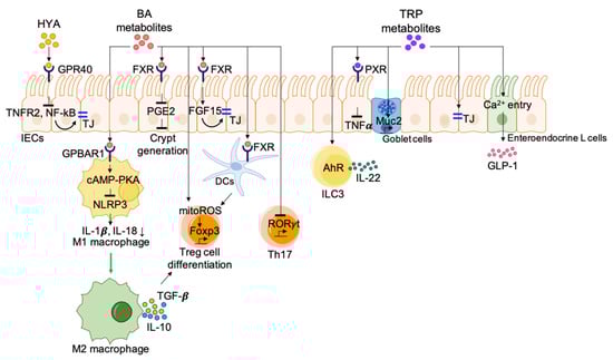 Host enzymatic reactions produce primary bile acids, and gut microbiota further produce various secondary bile acids that work as signaling molecules via interactions with receptors, such as the farnesoid X receptor (FXR), the vitamin D receptor, G protein-coupled bile acid receptor 1 (GPBAR1, also known as TGR5, GPCR19, or M-BAR), and the pregnane X receptor (PXR) [,,,]. Ablation of GPBAR1, FXR, or PXR causes increased susceptibility to chemically induced intestinal inflammation [,,,]. Specifically, bile acids activate GPBAR1 or FXR in macrophages, resulting in the differentiation of anti-inflammatory macrophages and the reduction in pro-inflammatory cytokine production via the inhibition of NLRP3-dependent inflammasomes and NF-κB-dependent signaling pathways []. Exposure of the GPBAR1 agonist shifts inflammatory M1 to anti-inflammatory M2 macrophages, consequently increasing Treg via the expression of IL-10 and TGF-β [,]. In terms of Treg differentiation, multiple groups have reported that bile acids play a significant role in the induction of intestinal Treg via the activation of bile acid receptors. IsoDCA, a secondary bile acid generated via the microbial epimerization of cholic acid, promotes Treg differentiation through FXR signaling on DCs []. Interestingly, in this study, researchers utilized a synthetic biology approach and designed minimal microbial consortia containing IsoDCA-producing bacteria to promote the RORγt+ Treg pool in the gut []. Intriguingly, the homeostasis of RORγt-expressing Treg is regulated by the gut bile acid pool rather than by a single type of primary or secondary bile acid []. A mixture of certain primary bile acids (e.g., cholic acid/ursodeoxycholic acid mix, chenodeoxycholic acid/ursodeoxycholic acid mix, cholic acid/chenodeoxycholic acid/ursodeoxycholic acid mix) and secondary bile acids generated from bacterial oxidation and dihydroxylation pathway preferentially maintains colonic frequencies of RORγt+ Treg and Foxp3+ Treg. This shows the importance of the host–microorganism biliary network in the maintenance of immune homeostasis in the gut []. In addition to their effect on Treg differentiation, bile acid metabolites are able to directly regulate the balance between Th17 and Treg cells. 3-oxoLCA signaling through RORγt inhibits the differentiation of Th17 cells. Another bile acid metabolite, isoalloLCA, also increases Treg differentiation through the enhancement of mitochondrial reactive oxygen species (mitoROS)-dependent Foxp3 expression []. One important regulatory function of secondary bile acids is the fortification of gut barrier function through multiple mechanisms, including the maintenance of intestinal barrier integrity and the inhibition of pathogen colonization. DCA downregulates prostaglandin E2 synthesis in an FXR-dependent manner, thereby accelerating intestinal crypt regeneration and wound repair []. Administration of a mixture of LCA and ursodeoxycholic acid helps to maintain gut barrier integrity through the activation of the FXR–FGF15 pathway [].
